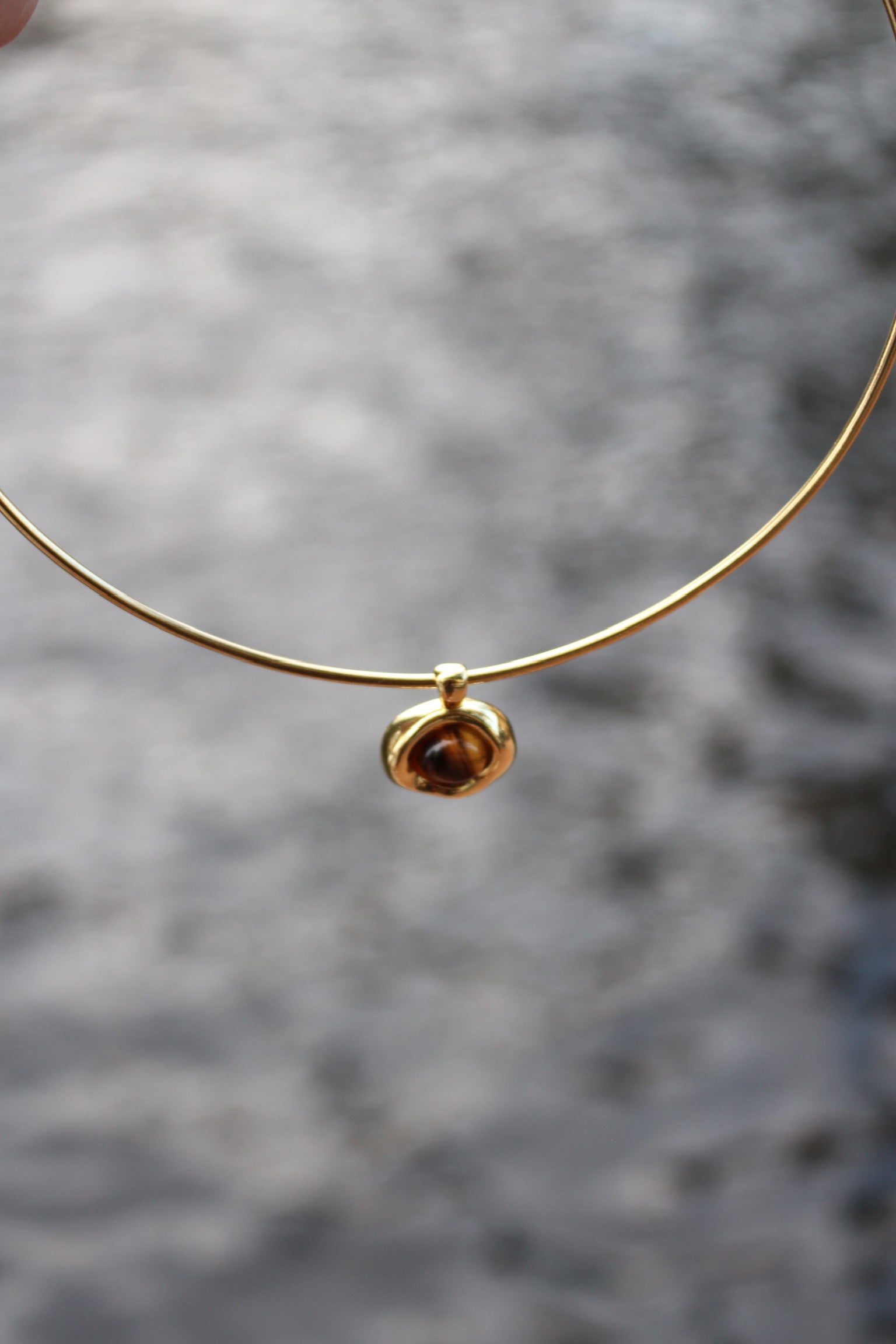 Radiant warmth meets refined elegance in our Chestnut Bezel Necklace. Centered with a captivating Tiger’s Eye gemstone set in a molten 14K gold-filled bezel, evoking the richness of sunlit amber. The pendent rests on a 2mm 24K shiny gold collar, adding a sleek, modern contrast to its organic depth. Designed to embody strength, protection, and natural beauty, this necklace is both statement and staple.
