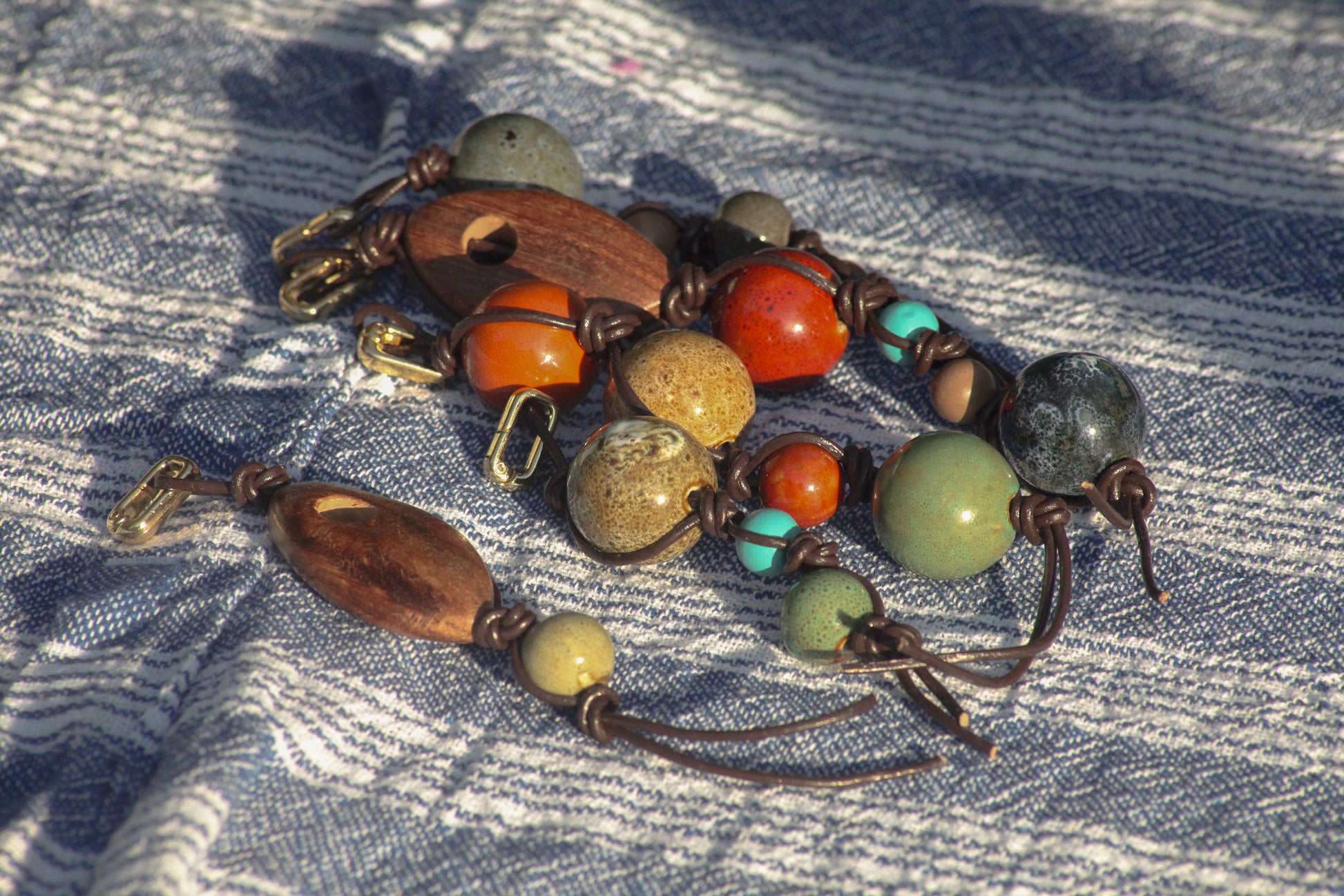 Our beautifully crafted bag charm, featuring a calming mix of brown and green ceramic beads, paired with a vibrant turquoise wood bead, all tied together on a rich brown leather cord. Cool and grounded, this piece channels breezy coastal days and brings a fresh, natural touch to any bag. Finished with a round gold carabiner clip for seamless attachments.