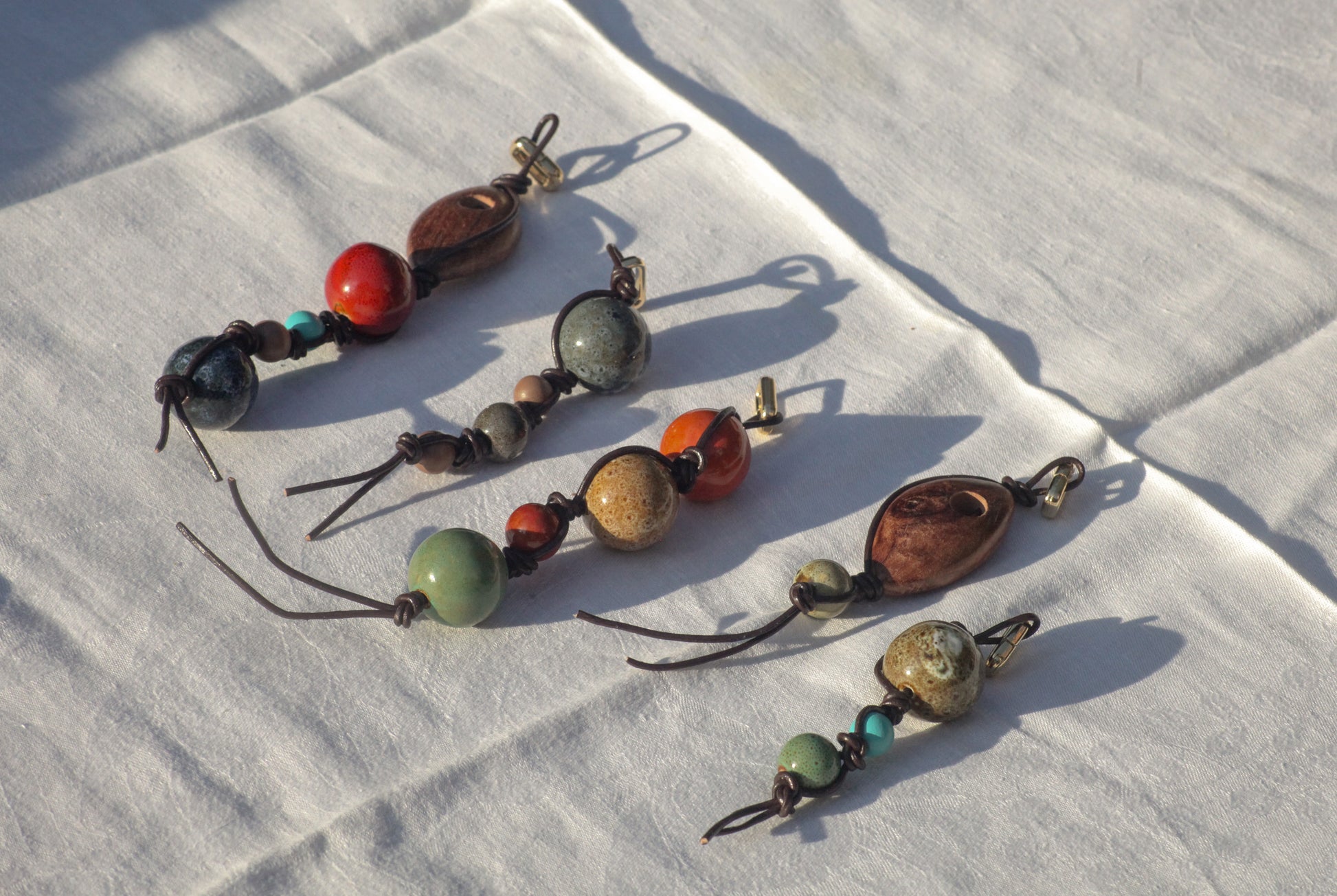 Our beautifully crafted bag charm, featuring a warm blend of orange, brown, red, and green ceramic beads, all tied together on a rich brown leather cord. Bright and earthy, this piece captures the carefree energy of summer days and adds life to any bag. Finished with a round gold carabiner clip for seamless attachments.
